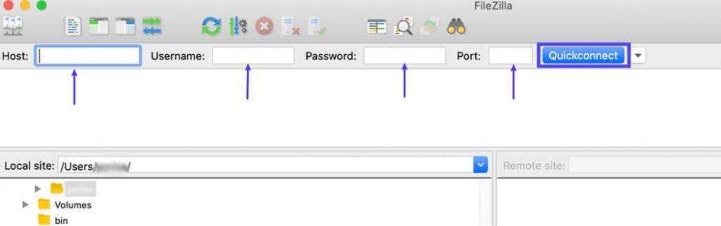 第2步:使用您记下的SFTP凭据通过FTP客户端(例如以下示例中的FileZilla)登录到您的服务器。在窗口顶部添加您的详细信息,然后单击快速连接。