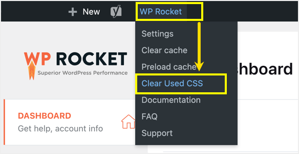 当您启动该过程时,WP Rocket将立即开始显示一个用于清除已使用CSS的新菜单项。您可以在“WP Rocket > Clear Used CSS”下的顶部管理栏中看到这一点。单击此菜单将从数据库表中删除所有存储的使用过的CSS样式。