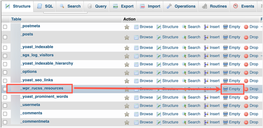 这个问题可能是由于页面构建器插件(如Elementor)、动态广告脚本和为单个页面使用自定义CSS的主题而发生的。这里的解决方案是禁用单个页面上的动态内容或手动清空数据库表,以便插件重新构建。您只需单击MySQL数据库表中的“清空”选项并确认弹出窗口即可删除其内容。