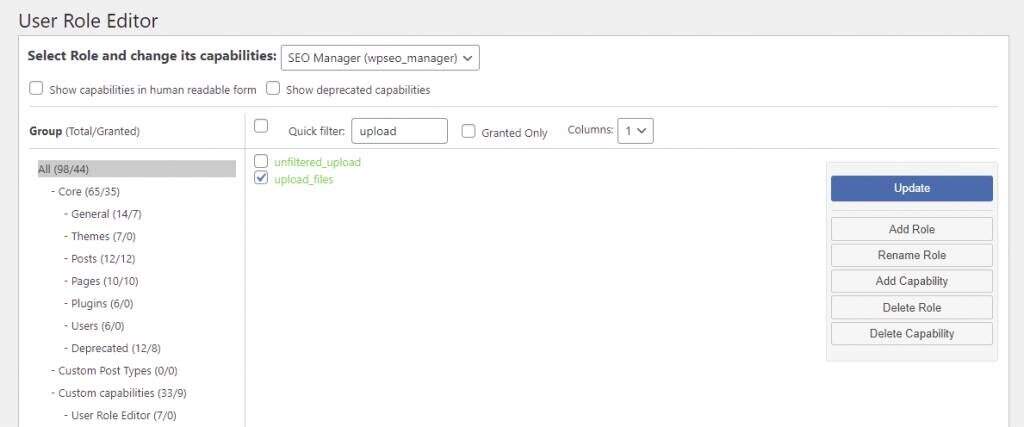 - 检查upload_files选项并单击Update。分配给此角色的WordPress用户现在可以访问媒体库,并能够在您的网站上上传和设置特色图片。