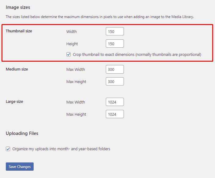- 在缩略图大小字段中为您的特色图像输入新尺寸。
