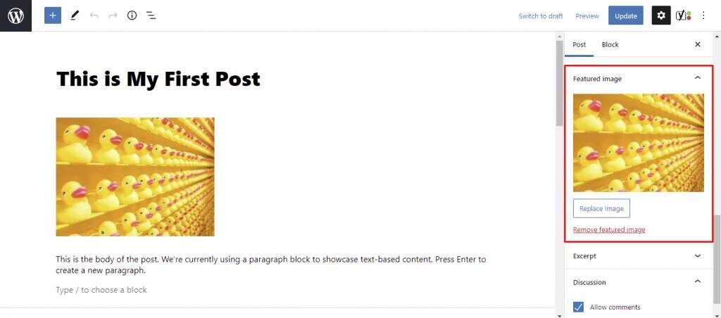 特色图片选项卡现在应该出现在您的内容编辑器中。单击设置特色图片按钮,然后从媒体库中选择所需的图片。