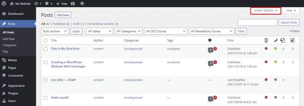 导航到您的WordPress仪表盘,然后单击屏幕选项。选中特色图片选项以在您的文章和页面列表中显示特色图片列。