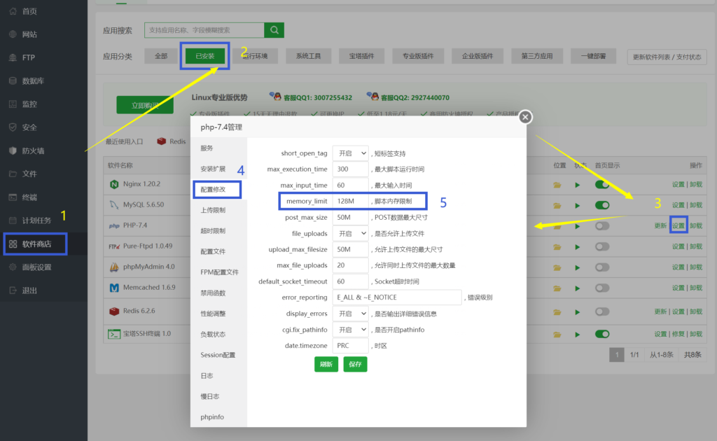 宝塔用户可以通过其控制面板更改PHP内存限制。这是如何做到的: