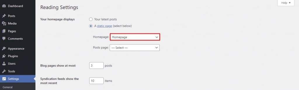- 返回仪表盘,然后导航到设置-> 阅读。将您的主页显示设置为静态页面。单击主页下拉菜单并选择您之前创建的页面。选择保存更改。