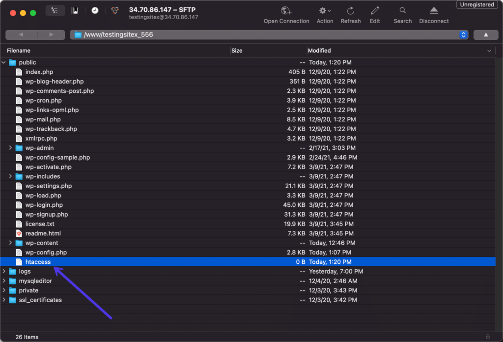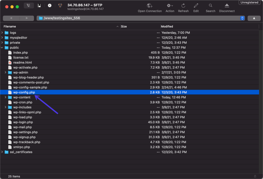 打开与WordPress文件的FTP连接。找到并打开根文件夹(通常以您的站点命名)并单击该/public文件夹。