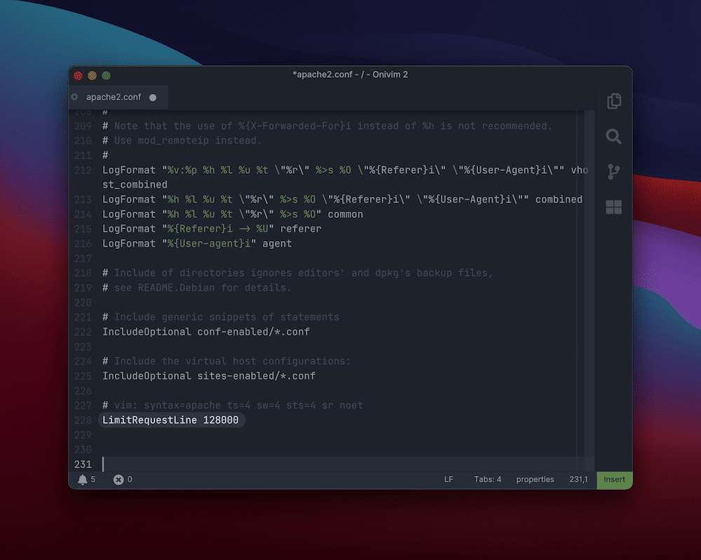 对于Apache配置文件,查找LimitRequestLine设置,如果不存在,则将其添加到文件底部: