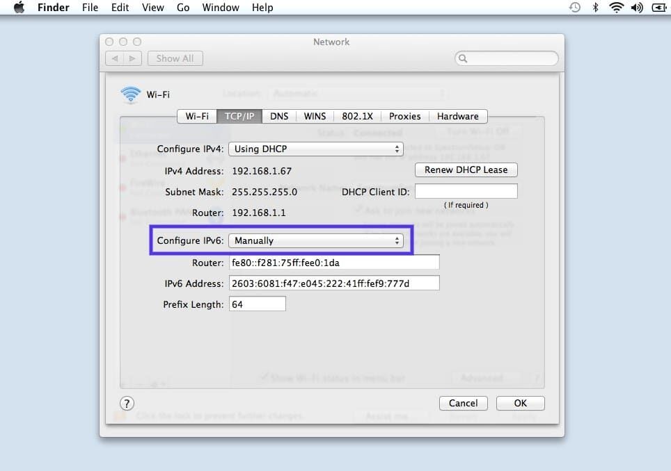 在TCP/IP选项卡下,单击配置IPv6下的下拉菜单 并选择手动。