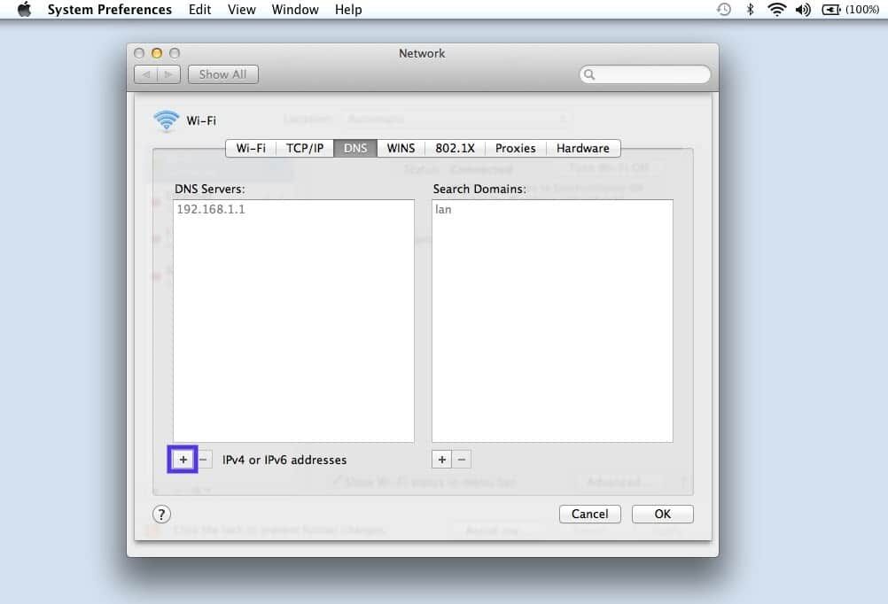 在此窗口中,选择您的连接,然后单击“高级”选项卡,然后单击“ DNS”。接下来,单击IPv4 或 IPv6 地址旁边的(+) 图标。