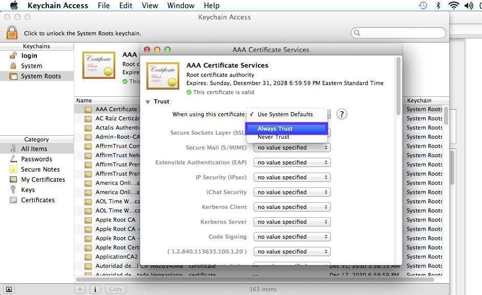 接下来,在左侧,单击System Roots。搜索网站的证书。找到它后,转到“信任”部分。然后单击“使用此证书”部分旁边的下拉菜单 并选择“始终信任”: