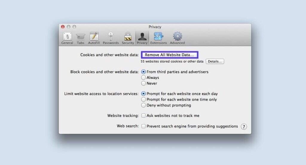 接下来,点击Preferences > Privacy,然后选择Remove All Website Data。