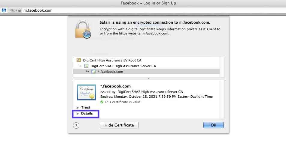 为此,您可以访问显示错误消息的网站,然后单击地址栏左侧的锁定图标,然后单击查看/显示证书 >详细信息。