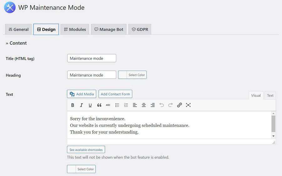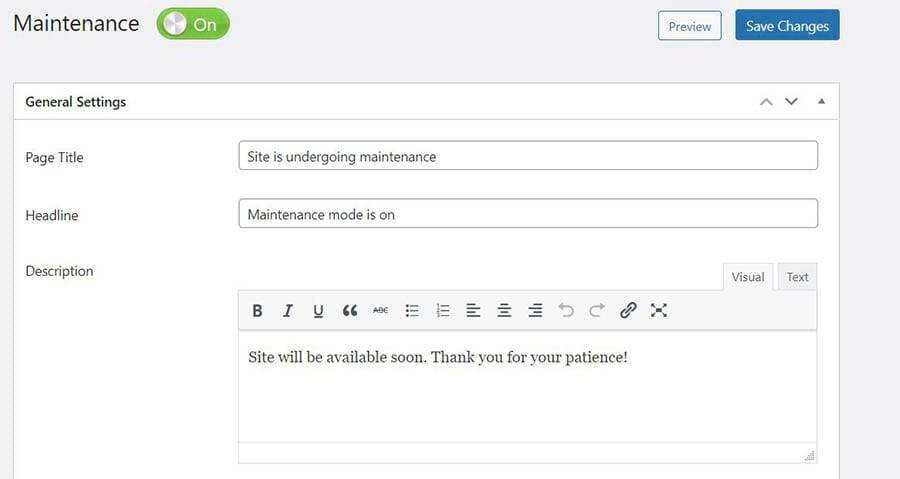 您还可以通过使用插件来避免默认的WordPress维护通知。这将使您能够在运行任何更新之前手动将站点置于维护模式。您还可以自定义消息。