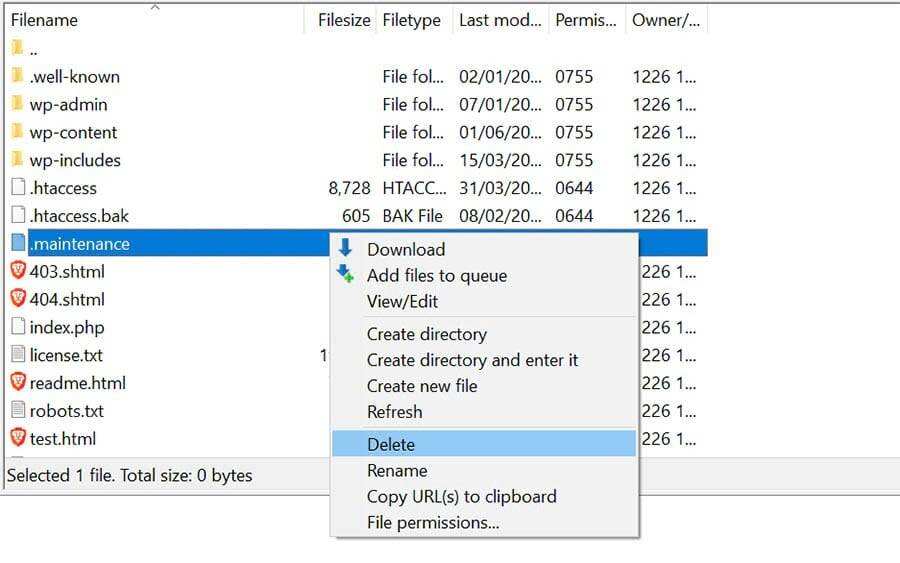 幸运的是,有一种非常快速的方法可以修复WordPress维护错误。您所要做的就是 从站点的根目录中删除.maintenance文件。