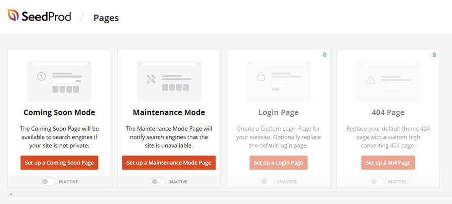 您可以使用的一种流行工具是SeedProd插件。安装并启用插件后,导航到管理仪表盘中的SeedProd >Pages。然后Set up a Maintenance Mode Page。