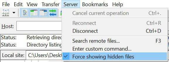 如果您使用的是SFTP客户端并且在目录中看不到该文件,则它可能被隐藏了。要找到它,请转到菜单并单击服务器 >强制显示隐藏文件。