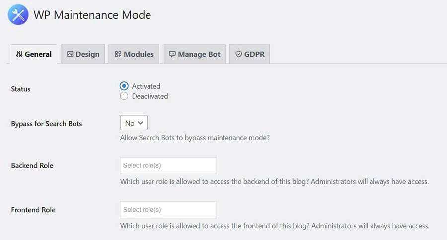 完成后,单击页面底部的Save settings。要激活维护模式,请转到“General” 选项卡并选择“Activated”选项。