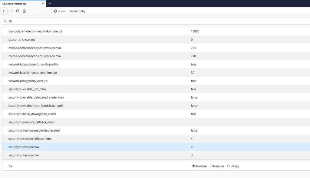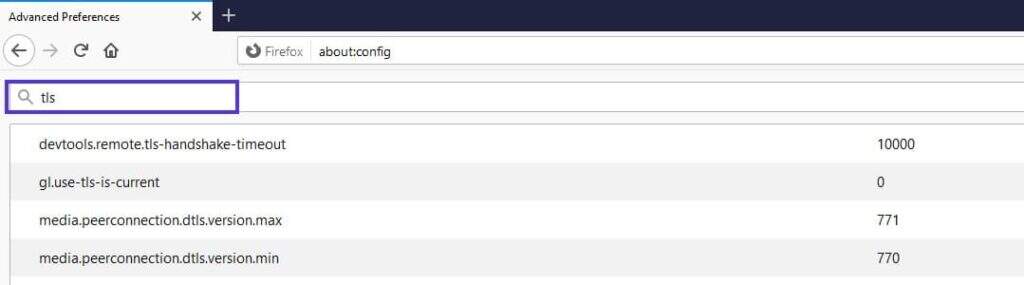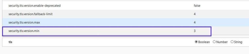 为此,请返回到Firefox 浏览器中的about:config屏幕。再次,在搜索栏中输入“tls”。从列表中,导航到security.tls.version.min: