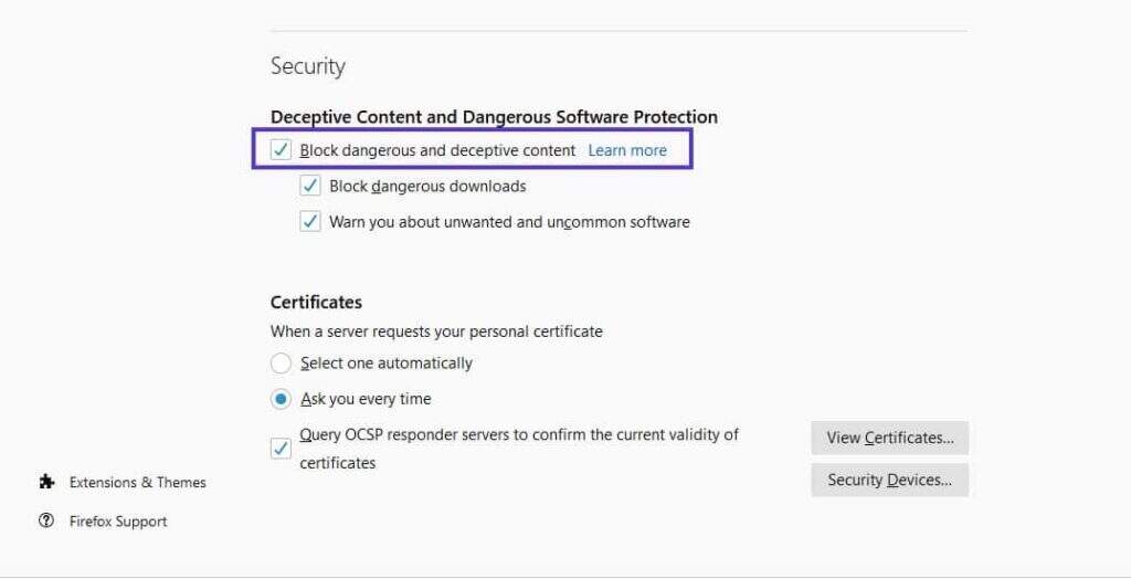 在安全部分下,取消选择阻止危险和欺骗性内容: