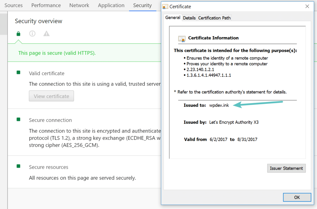 检查证书上当前域名问题的另一种简单方法是在站点上打开Chrome DevTools。右键单击网站上的任意位置,然后单击“检查”。然后单击安全选项卡并单击“查看证书”。颁发的域将显示在证书信息中。如果这与您当前所在的站点不匹配,则这是一个问题。