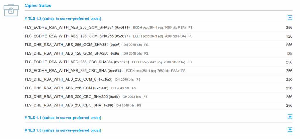 安全研究人员、Google和Microsoft建议禁用RC4。因此,您应该确保使用不同的密码套件启用服务器配置。您可以在SSL Labs工具中查看当前的密码套件(如下所示)。