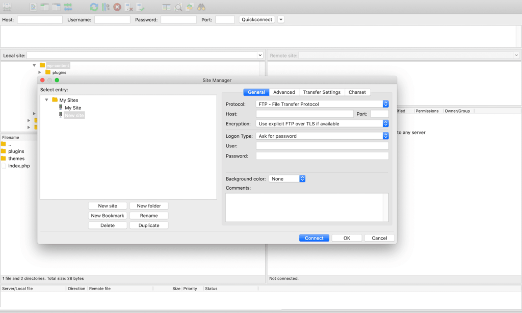 如果您是第一次连接到您的服务器,请选择New Site。然后,您可以为此连接指定一个名称: