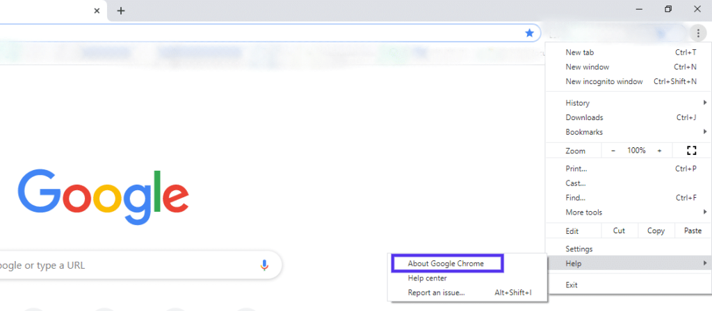如果您在重新启动浏览器后仍然遇到ERR_SPDY_PROTOCOL_ERROR,则可能需要更新它。要检查您的Chrome浏览器是否是最新的,请单击浏览器右上角的三个垂直点。然后转到“帮助”>“关于Google Chrome”: