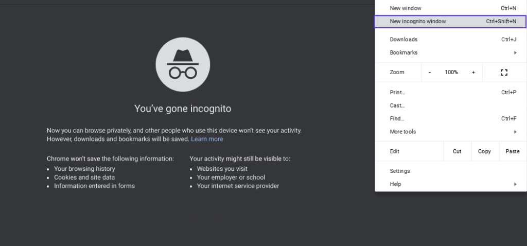 另一个简单但通常有效的解决方案是在“隐身”模式下使用浏览器。为此,请选择浏览器的菜单并单击新建隐身窗口: