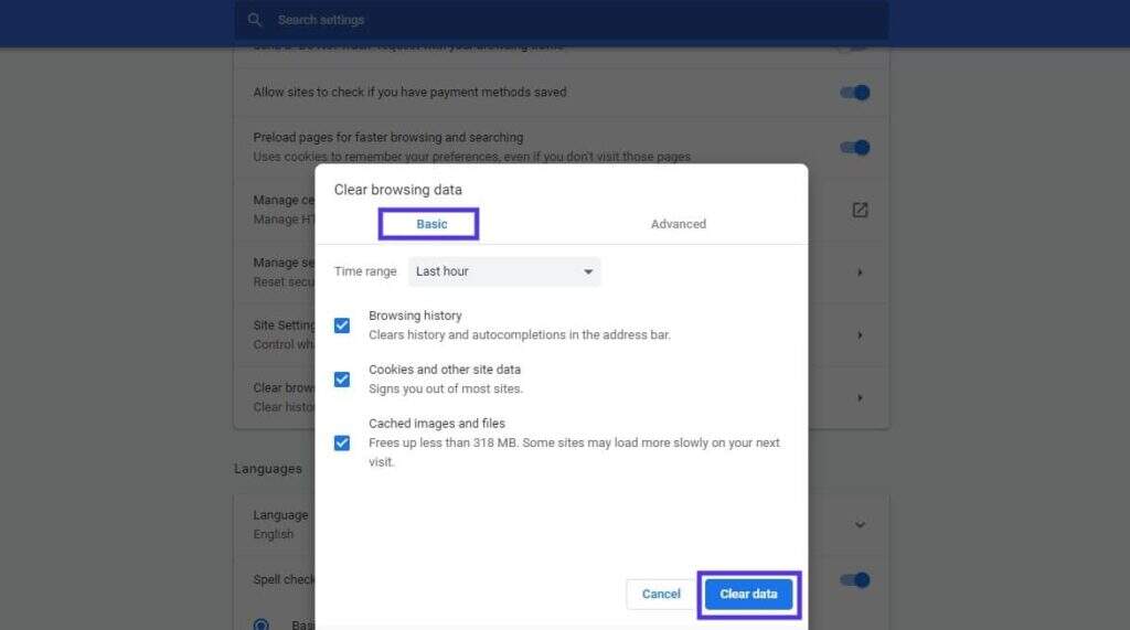 我们建议留在基本选项卡中。这样,浏览器将保留您的密码、自动填充数据等。只需选择清除数据, 然后让浏览器稍等片刻即可工作。