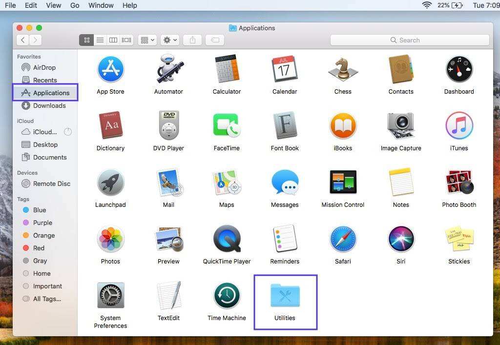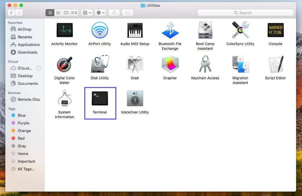 接下来,向下滚动并单击Utilities文件夹,然后单击Terminal: