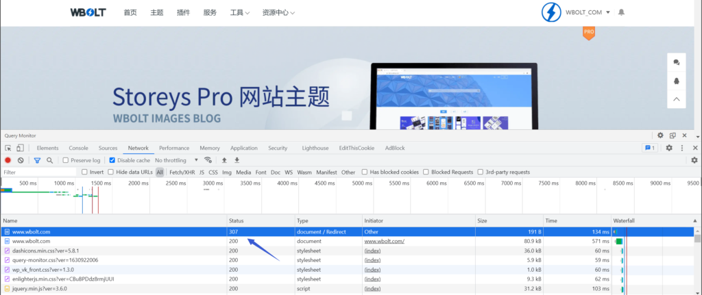 现在,让我们用闪电博尝试相同的示例。访问http://www.wbolt.com会导致网络请求,如下面的屏幕截图所示。