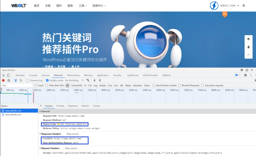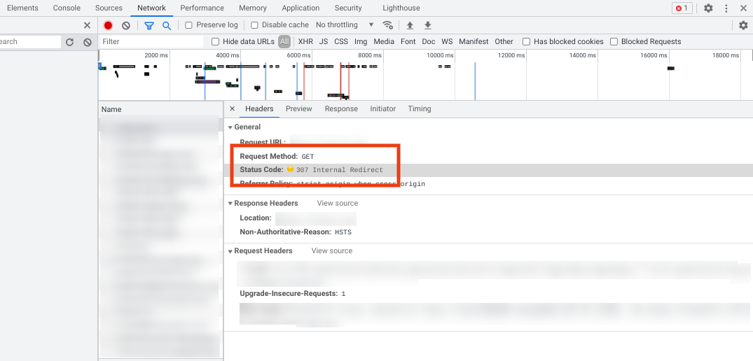 站点的第一个请求与前面的示例类似,但这次会导致307 内部重定向响应。单击它会向我们显示有关此响应的更多详细信息。