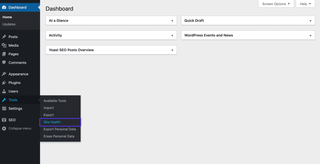 您可以在WordPress中使用Site Health工具直接执行此操作。要访问它,请导航到工具>站点健康: