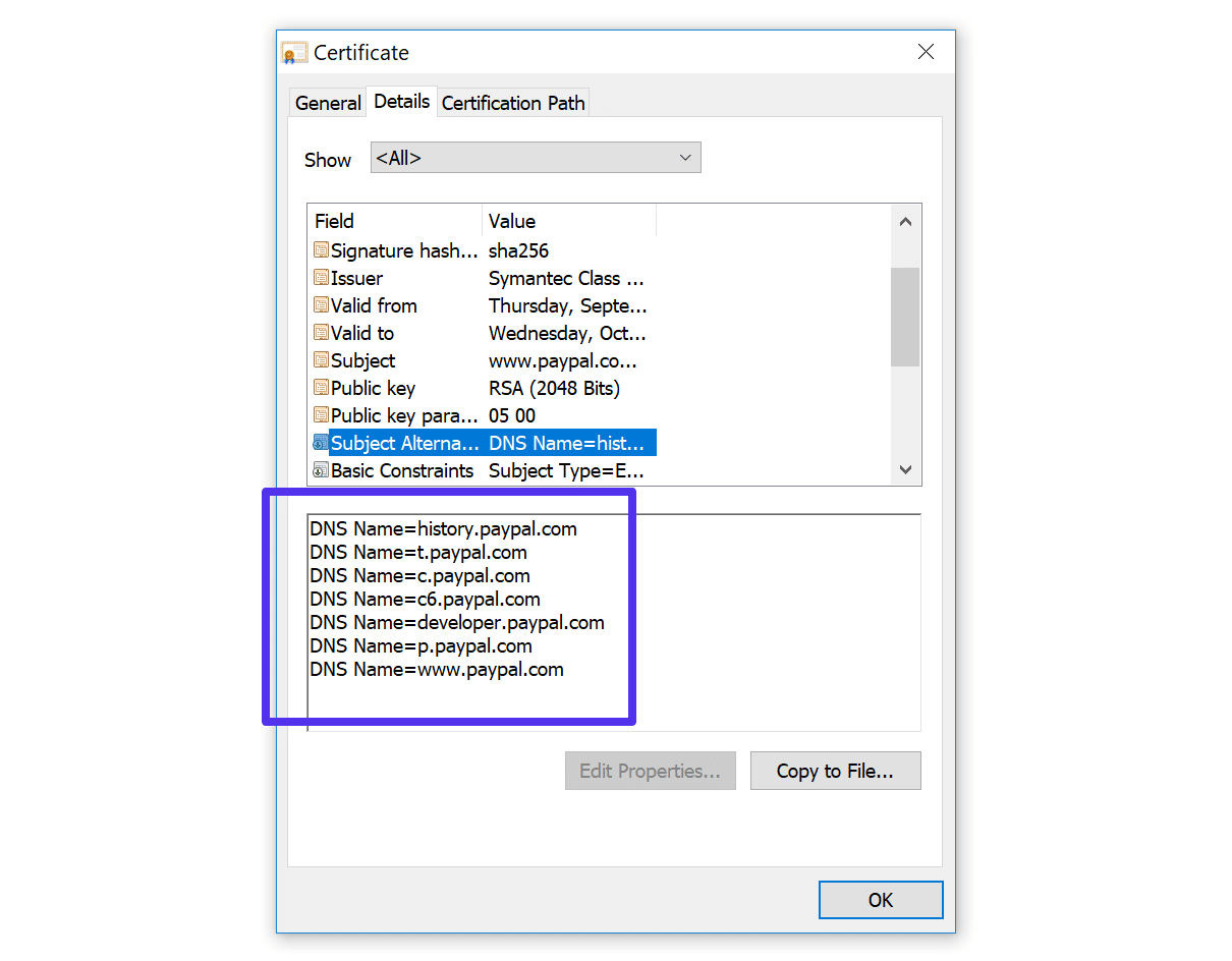 大多数证书现在使用SHA-256哈希算法。在网站上检查证书时,可以在“详细信息”选项卡下找到此信息。