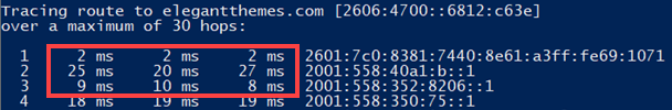 最后一组数字来自您的目的地及其设置。它可能会通过像Cloudflare这样的CDN,如果这里有星号或高延迟ping,您需要联系该网站的管理员以确定发生了什么。