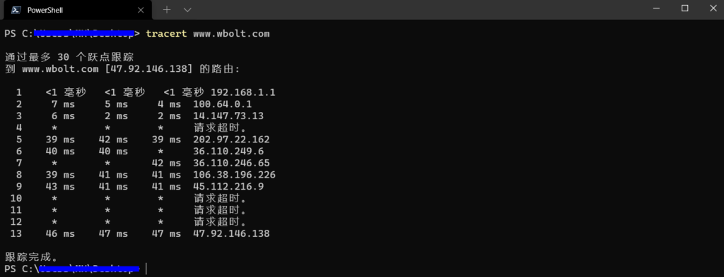 您可以输入cmd或powershell,Windows将打开相应的工具。一旦它打开,只需输入Windows跟踪路由命令tracert www.baidu.com(或您要跟踪的任何URL或IP)。