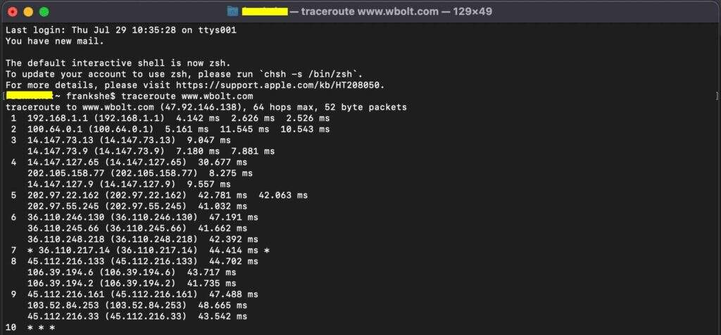 Mac上的命令也与Windows上的不同。您将运行Mac跟踪路由命令traceroute www.wbolt.com而不是tracert。但是,您获得的信息将大致相同。在Mac终端中,信息以相反的顺序传递,即使运行到同一个地方,你得到的也是IP地址,而不是PC上的MAC地址。