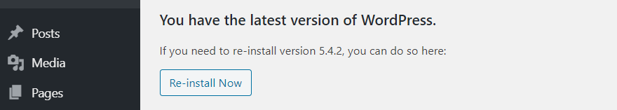 准备好开始使用后,请转到仪表盘>更新并查找显示 您拥有最新版本的WordPress并在下方单击“重新安装” 按钮的消息: