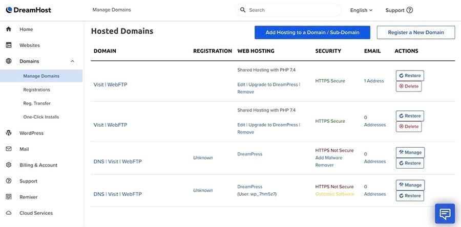 要将DreamShield添加到您的帐户,请登录到您的DreamHost仪表板。然后您可以导航到Domains> Manage Domains。