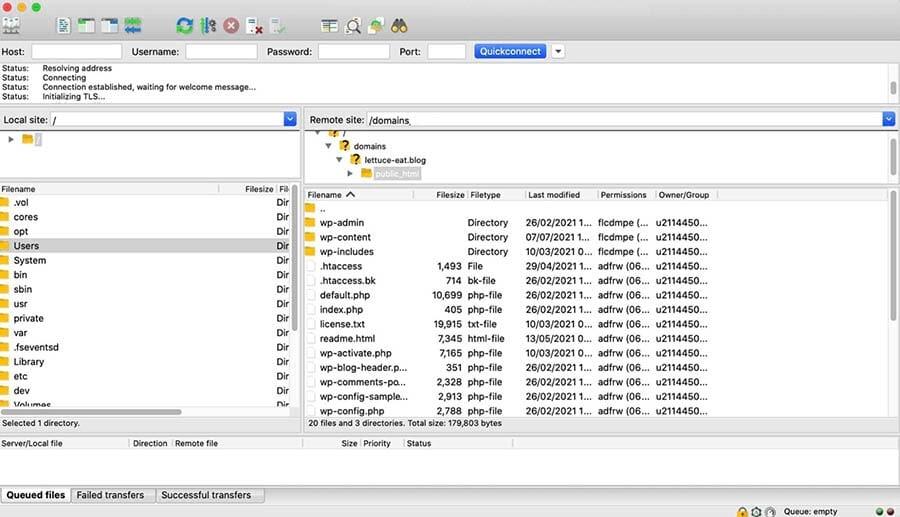 如果您没有DreamSheild附加组件,则需要手动删除这些文件。最佳方法会有所不同,具体取决于黑客攻击的性质。但是,通过 使用FileZilla等客户端通过安全文件传输协议 (SFTP)连接到您的站点,您通常可以获得积极的结果。