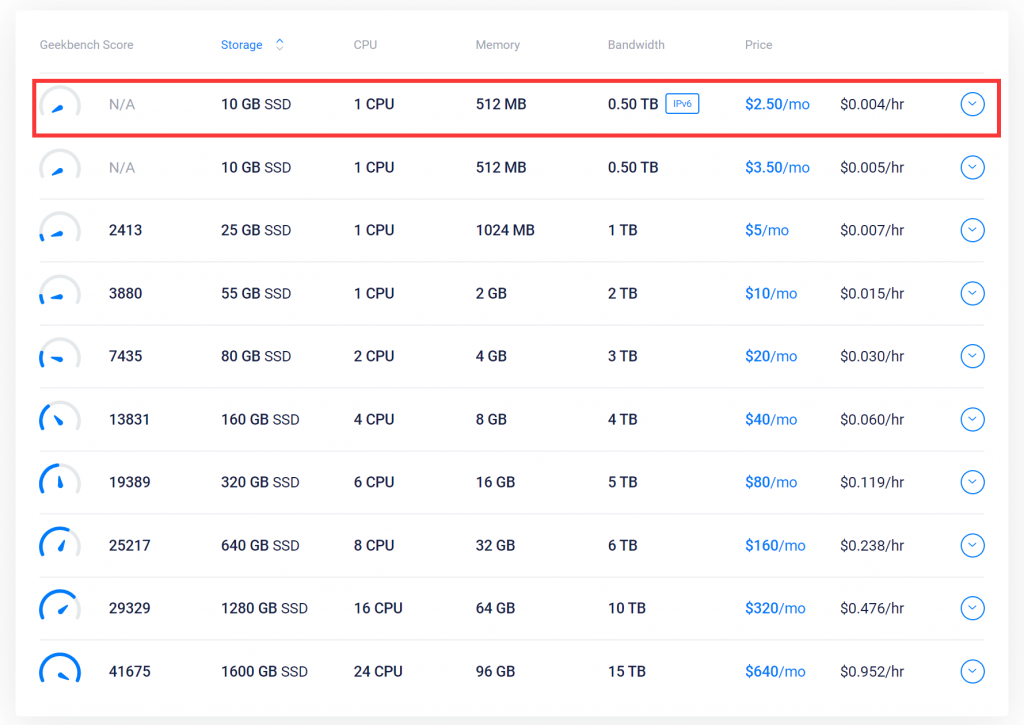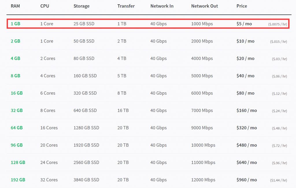 在价格上,Vultr 甚至要比 Linode 还要有优势,最低的套餐去到逆天的 2.5美金/月,当然配置会稍微比 Linode 的 5美金/月套餐稍微差一些,20GB的固态硬盘、1CPU、512MB内存和500GB 的流量。