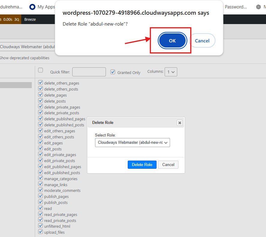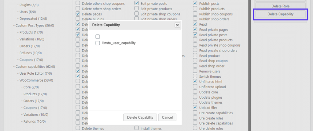 您应该注意,仅当未将任何权限分配给非管理员时,才会显示Delete Capability按钮。否则它是隐藏的。