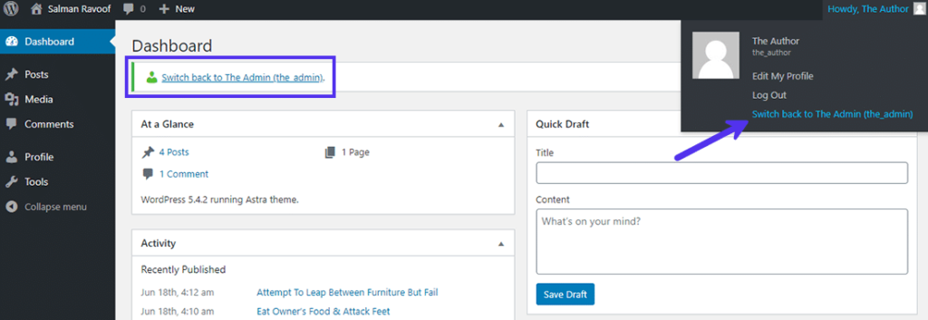 为了进一步简化用户切换,您可以安装Admin Bar User Switching扩展以使Switch to user链接出现在您的管理栏中。
