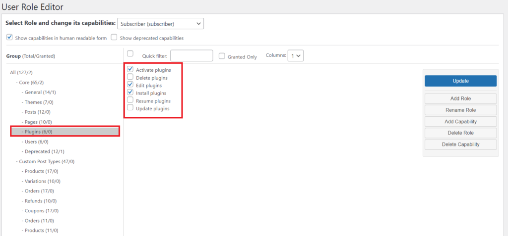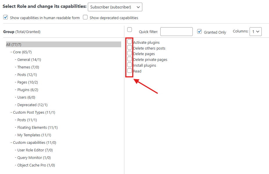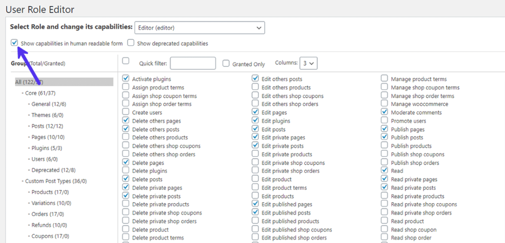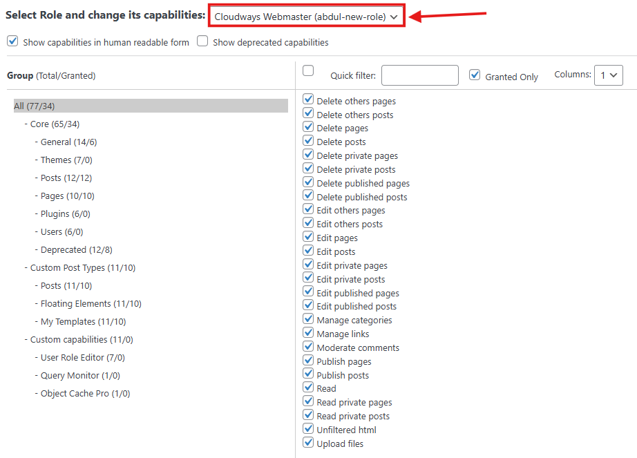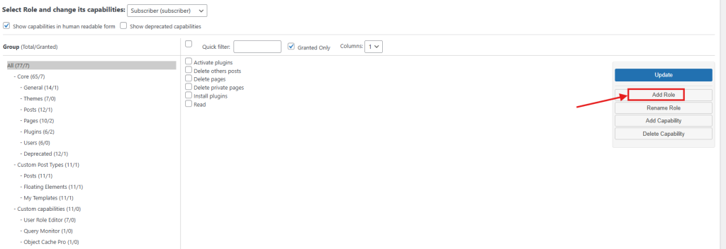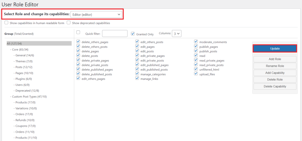注意:User Role Editor不允许您删除WordPress的内置角色或权限。如果它分配给任何用户,它也不允许您删除任何自定义角色,如果它分配给任何非管理员角色,它也不允许您删除任何自定义权限。