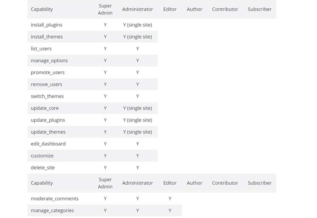 WordPress Codex包含一个简单的Capability vs Role Table,尽管它不是那么直观。它总结了默认用户角色在单站点和多站点WordPress设置中可以执行的所有操作。在一定数量的权限之后会有一个中断,以便您轻松区分高级和低级权限。