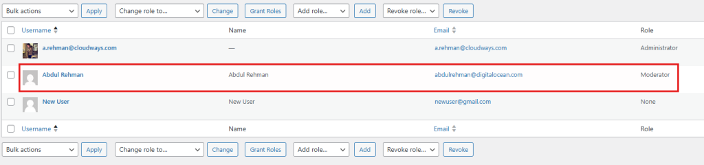 要为用户分配多个角色,您需要转到仪表板中的“Users”面板,然后单击将鼠标悬停在用户名上后将在下面看到的“Capabilities”链接。