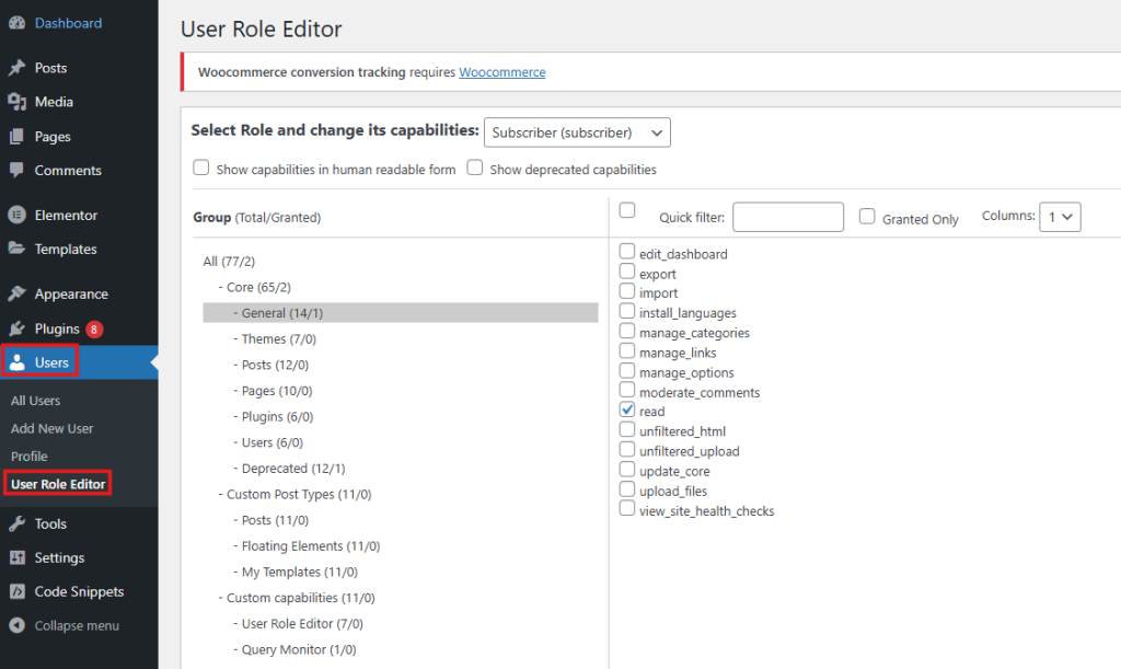 我们将在本文后面讨论如何添加或自定义所有用户角色或特定用户的权限。
