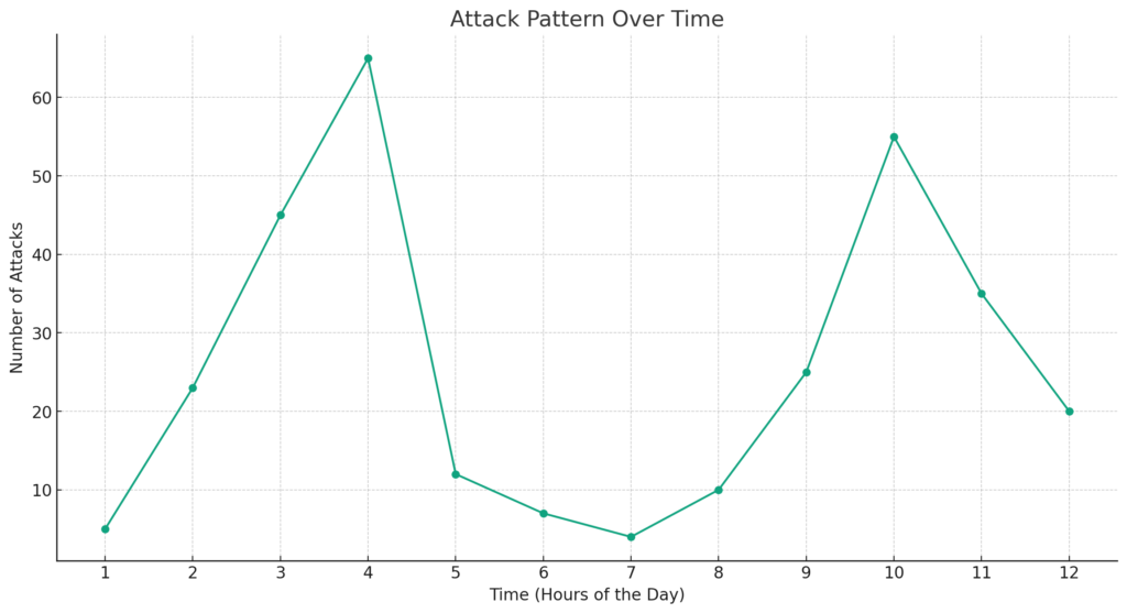 - 低谷和平静期:相反,图表跌至最低点的时期,尤其是第 7 小时左右,表明攻击尝试处于最低水平。这些低谷期可能与网站的非高峰期相对应,此时的流量通常较低,对攻击者的吸引力可能较小。