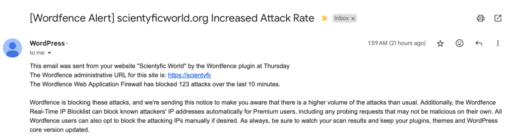 - 主题行:电子邮件的主题会立即通知您警报的性质:[Wordfence 警报] yourwebsite.com 攻击率增加( [Wordfence Alert] yourwebsite.com Increased Attack Rate)。这使您能够识别警报的重要性并迅速采取相应行动。