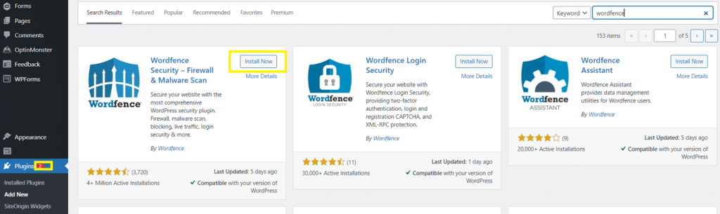首先,我们要安装免费版的 Wordfence 插件。为此,请登录 WordPress 仪表板并导航至插件 > 添加新插件。然后搜索 Wordfence,点击 Wordfence Security – Firewall & Malware Scan 下的 Install Now(立即安装):